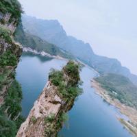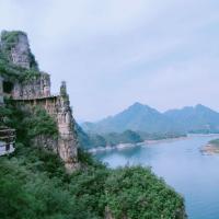 易水湖被称为“小桂林”是有些过誉了,但的确是风光秀丽。进入景区大门,直接就是码头,游览易水湖主要是登上湖对岸的老子峰,而乘船是唯一抵达方式。因此买往返船票是必须的,你能选择的只是乘大船还快艇。老子峰有3公里长的环形临水登山栈道,虽然蜿蜒曲折