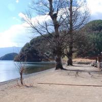 走到湖边开始觉察泸沽湖的美了,离湖水很近的地方觉得湖水还是很蓝的,岸边停泊着许多的著名的猪槽船,淡黄色的木色和蓝蓝的湖水及其相配,都是最原始的颜色,风很大,慢慢地阳光开始变好了,爬到野山坡上,一般的经验总归是站得越高风景越好