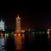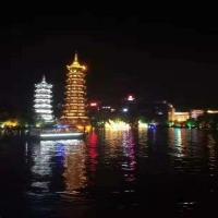 两江四湖总体不错,灯火阑珊,水波粼粼!沿路歌舞升平,火树银花!桥比路多,树比桥多!日月双塔堪称点睛之**,一金碧辉煌,一银曳生辉,交相呼应,直耸湖中,两江四湖名不虚传……如果行程再稍微长一点,能到象鼻山附近就更好了,这样只能远远的看到象鼻山