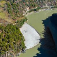 怒江流经云南贡山县丙中洛乡日丹村附近,由于王箐大悬岩绝壁的阻隔,江水的流向从由北向南改为由东向西,流出300余米后,又被丹拉大山挡住去路,只好再次调头由西向东急转,在这里形成了一个半圆形大湾,称为怒江第一湾。