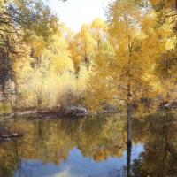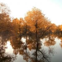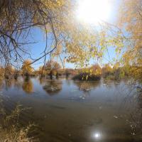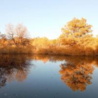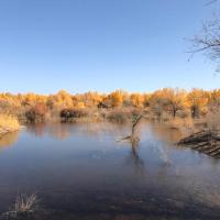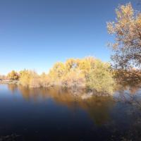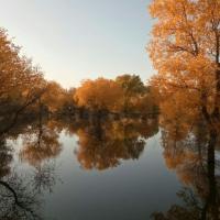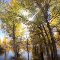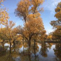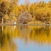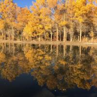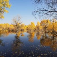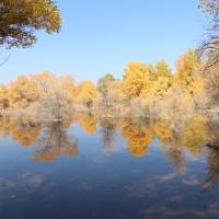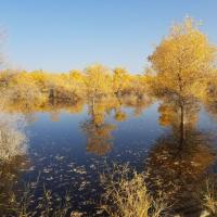 金塔胡杨林都美,不仅仅在于金灿灿的胡杨树,最主要的在于他的水,可以看到蓝蓝的天、蓝蓝的水、金色的胡杨和金色的倒影,这个确实只有在金塔胡杨林才可以看到。