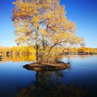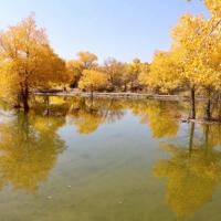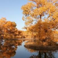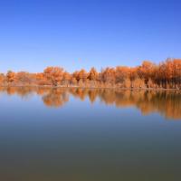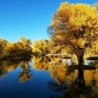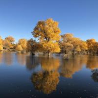 金塔胡杨林,甘肃酒泉的人造胡杨林景区。其特色在于水上倒影,胡杨黄得浓烈,天空蓝的纯粹,水中倒影两种极致色彩辉映,一转眼都是炫目的油画。