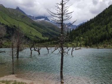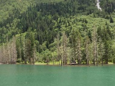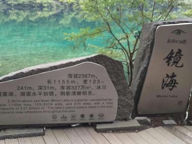 镜海,因为湖面一平如镜,故得其名。这里是九寨沟看倒影的好地方。每当晨曦初露或朝霞遍染之时,蓝天白云、远山近树,尽纳海底。早9点前和晚5点后无风的时候,是拍摄镜海倒影的最佳时间。镜海紧邻在空谷的下游,湖呈狭长形,长约一公里,为林木所包围。对岸山璧像一座巨大的石屏风。...