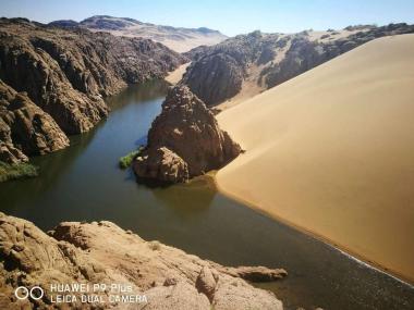 阿拉善大漠天池位于内蒙古自治区阿拉善盟阿右旗境内,是藏身于巴丹吉林沙漠中罕见的一处沙漠堰塞湖,据说这样的堰塞湖在全球也是罕见的,当地人称它为“岗根淖尔”。褐色的花岗岩山如同一道屏障阻挡了细密黄沙的移动,碧水、黄沙、褐山、蓝天、白云,它们形成了一道美丽且奇特的景观,我于是想,阿拉善大漠天池应是大海留在大漠的遗珠。...