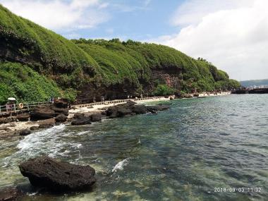 滴水丹屏位于涠洲岛滴水村南岸边,原名滴水岩。绝壁上部绿树成荫,壁上层间裂隙常有水溢出,一点点往下滴,如朱帘垂挂。由于海蚀作用,岩石的外表形态犹如一有眼、有鼻、有嘴、有发的巨型侧面“人头像”(现已倒塌),景致优美。...