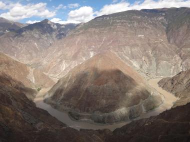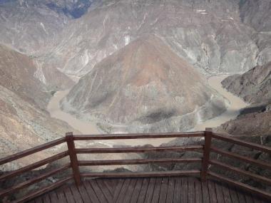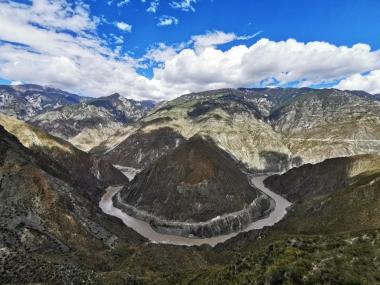 金沙江大拐湾也叫做月亮湾,由北向南纵贯全境的定曲河,在先后接纳了玛伊河和硕曲河之后,携三江之水投入了金沙江的怀抱,在江水汇合处,形成“三壁夹两江”的奇景。穿山越谷而来的金沙江,由此水势更加浩荡,峡谷逐渐开阔,在即将冲出这川滇要塞之时,它似乎想先舒缓一下长途奔波的疲劳,于是放慢脚步,围绕着金字塔般的日锥峰潇洒地画了一个“Ω”字形的大拐弯。孰料这不经意的即兴之作,竟成就了一处奇观。...