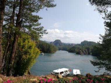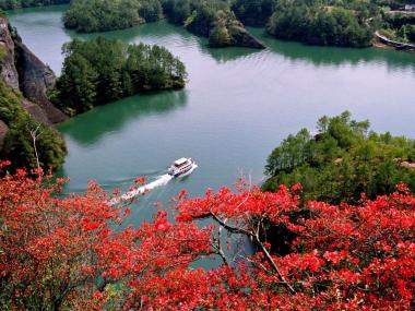 石门湖位于连城冠豸山东南,两岸是满眼青葱的高山,湖水光滑如镜犹如一块镶嵌在冠豸山险峰奇谷之间的翡翠,水随着山势蜿蜒流淌,碧水青山交相辉映,荡舟其中好比置身山水画间,无处不在的清幽、碧绿让人倍感放松。