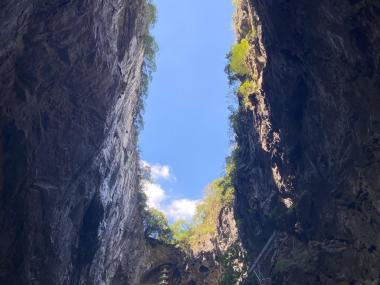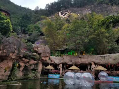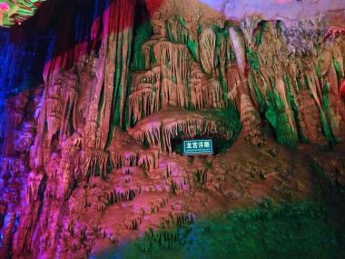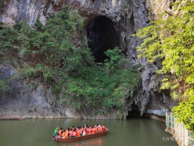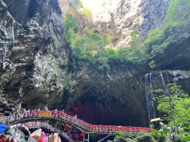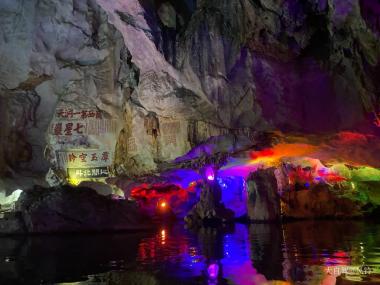 洞天仙境集天坑、溶洞之景于一体,坑洞相连,非常奇特。这里天坑密布,绿树成荫,洞内形态各异的钟乳石错落其中,在景观灯的照耀下,绚丽斑斓,游人泛舟而过,可谓“别有洞天”。游玩洞天仙境,可以沿着栈道漫步,欣赏周围怪石嶙峋,绿树成荫的绝美景色,也可以体验透过一个个天坑仰望天空的奇特景色。...
