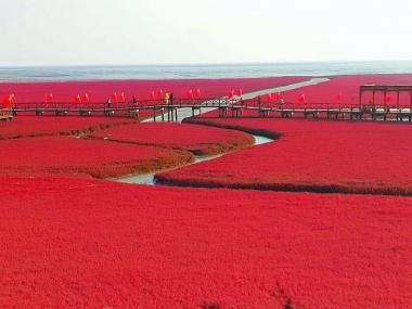 盘锦红海滩位于辽宁省盘锦市。红海滩以全球保存得最完好、规模最大的湿地资源为背景,以举世罕见的红海滩、世界最大的芦苇荡为依托,包括苇海寻踪、小岛闲情、踏霞漫步、岁月小栈、油田观景、廊桥爱梦等步道和景点。...