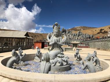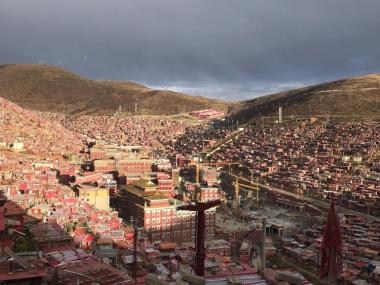 色达五明佛学院全称是色达县喇荣寺五明佛学院,海拔4000米上。在重重的群山环绕之中,以佛学院的大经堂为中心,密密麻麻搭满了四面的山坡,不计其数的绛红色小木屋,延绵无数,一眼望不到头。这些红色小木屋,是一万多名僧侣的住所(出家男子称扎巴,出家女子称觉姆即女尊者)。在转经塔西南方向满是经幡的山坡上可以俯视整片佛学院,这里可以拍摄出佛学院的全貌。...
