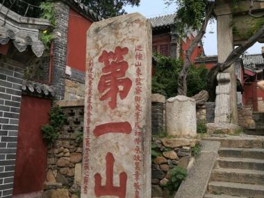 孔子登临处位于一天门北,为四柱三门式跨道石坊,古藤掩映,典雅端庄,明嘉靖三十九年 (1560)始建。坊两侧分立两碑,东为明嘉靖间济南府同知翟涛题“登高必自”碑,西为巡抚山东监察御史李复初题“第一山”碑。北侧为两柱单门的“天階”坊。相传孔子“登东山而小鲁,登泰山而小天下”,登临点就在这里,是历来儒人文士必到之处。"...