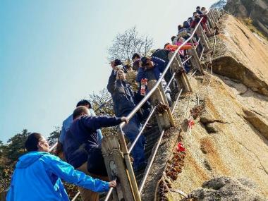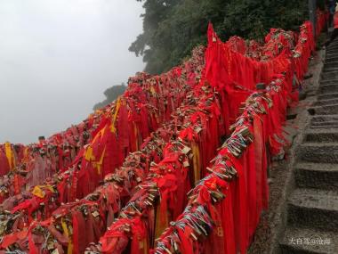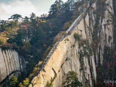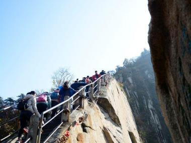 华山北峰苍龙岭是华山著名险道之一,莽莽苍苍,岭呈苍黑色,笔直插天,好像苍龙腾空。此岭上的台阶只有2尺多宽,两旁万丈深壑,势陡如刀削斧劈。岭脊上下高差约500米,坡度在45度以上。在这里遥望青松白云,耳听风声大作,令人心惊目眩。若是夜晚登山,遥望苍龙岭,只见到远远无数灯点排成笔直一线,斜向天际,慢慢向上移动,是游人打着手电或头灯在岭上攀登,看去宛如登天。...