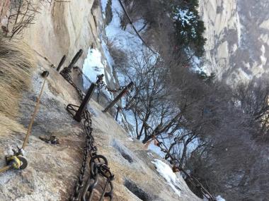 鹞子翻身是从东峰到下棋亭必经的一段绝壁险道,为华山著名的险道之一。其路凿于上凸下凹的倒坎悬崖上,下视唯见寒索垂于凌空,不见路径。游人至此,须面壁挽索,以脚尖探寻石窝,交替而下,其中几步须如鹰鹞一般左右翻转身体才可通过,故得此名。现在鹞子翻身险道全面整修,凿深了脚窝和石阶,多处更换了铁索,要下峰探险相对容易了一些。...
