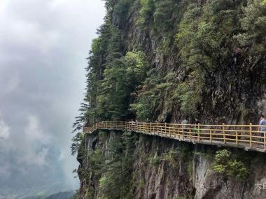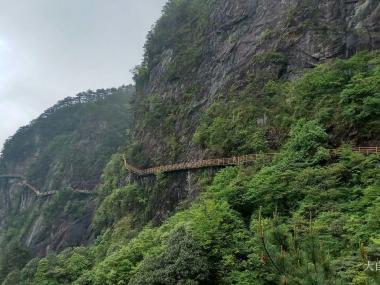 青云栈道在明月山山顶,是欣赏明月山风景的独特位置,拥有“绝壁览胜”一大景观,位于海拔1700米处,全长3100米左右,常年云雾缭绕,行走其上,有平步青云之感。悬空的栈道横亘于悬崖峭壁上,如盘云的游龙。崖壁上,迎客松及各类灌木点缀左右,形态万千,是最受游客喜爱的景致。...
