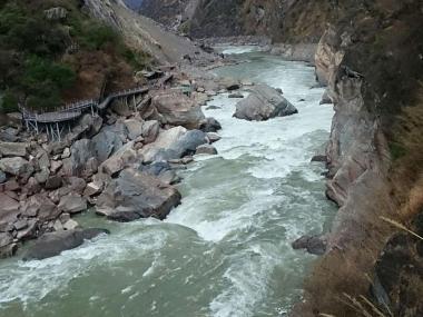 虎跳峡(丽江段)以深和险而闻名,有上、中、下三段,位于丽江玉龙县的虎跳峡属于上虎跳。上虎跳因为峡谷窄,所以水流落差很大。在这里观看河水拍打江心的虎跳石,非常壮观,很多人都会在这里拍照。这里的设施完备,栈道完整,游玩轻松方便。景区内的栈道大约2公路,沿着崖壁而建。...