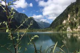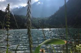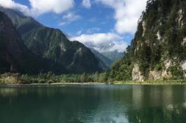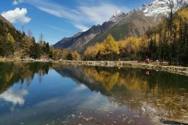 磐羊湖位于理县毕棚沟,湖泊周边水草、灌木生长茂盛,四周群山环绕,蓝天白云、雪山冰川倒映其中,融为一体。因盘羊在这里活动最为频繁,故当地取名为“磐羊湖”.游客可在月亮湾下电瓶车后,可沿木栈道漫步环绕磐羊湖一周,欣赏海