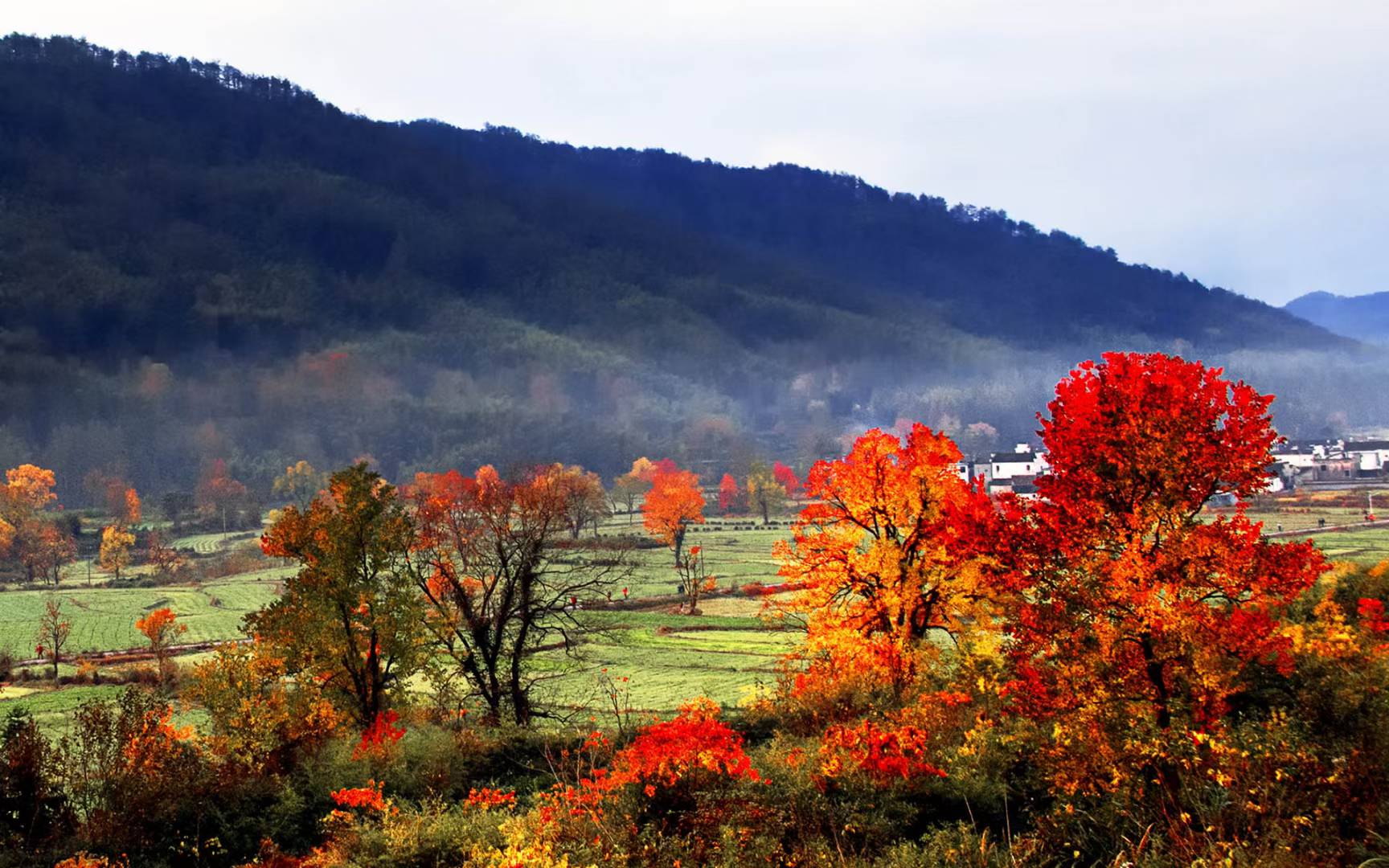 塔川的乌桕树在秋季呈现出金黄到火红的渐变,古村似被打翻的调色盘包围;