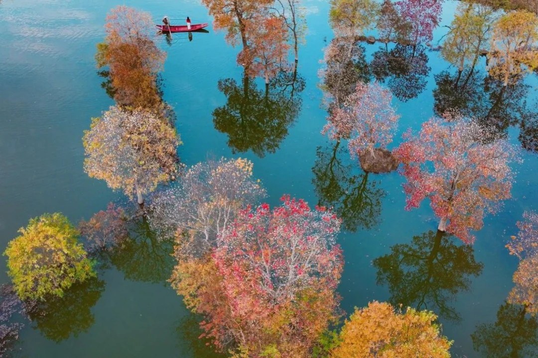 河西畈村以“水上红叶”闻名,晨雾中的景象尤为迷人。清晨薄雾中,乌桕树的倒影在天堂湖水面若隐若现,如梦似幻。
