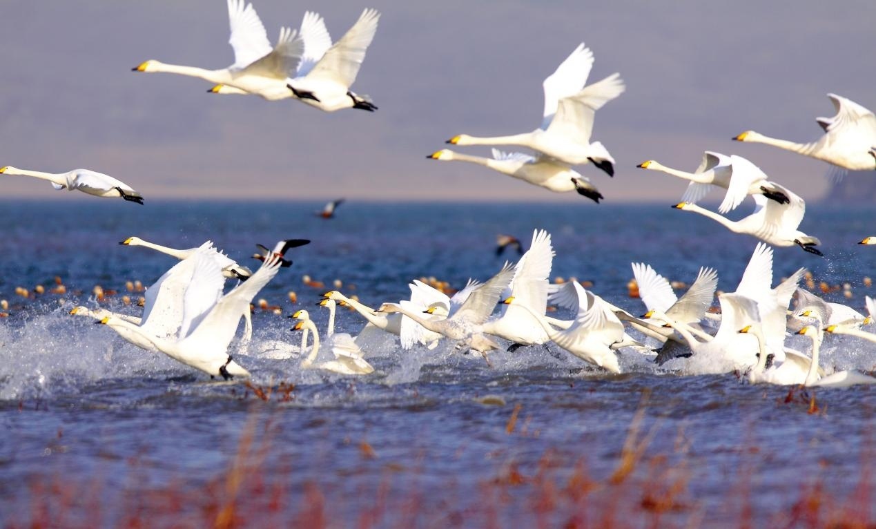 红村天鹅湾是东北地区重要的天鹅越冬栖息地,一只只天鹅悠然游弋,它们时而翩翩起舞,时而追逐嬉戏,蜿蜒的河水中,倒映着天鹅婀娜的身姿,构成一幅幅怡美的自然画卷。