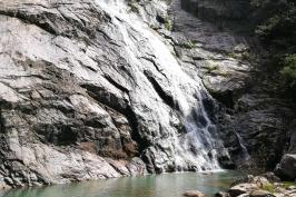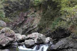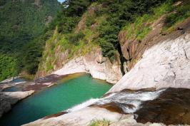 百杖潭景区位于浙江中部磐安县境内,距县城安文镇32公里,是一处集叠瀑、奇石、曲溪、幽洞等为一体的景区。区内奇石纷呈、飞瀑成群、怪石错列、绿水碧潭,山光水色,相映成趣“秀瀑孕深潭,绝峰育奇石,龙溪十八渡,石上四重天”是
