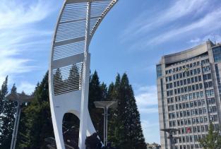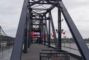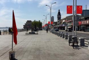 因为在服务区睡觉了,所以我们到鸭绿江断桥时,天已经亮了,雾蒙蒙的。到处悬挂五星红旗,为祖国母亲庆生