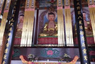铁山寺国家森林公园内有三宝,大雄宝殿前的“金蟾石”、大雄宝殿上的“九龙黄金匾”、南海观音像。今天都2008-10-11了,旅友所提红幕后的得道高僧还在呢!还在为广大有缘者指点迷津。