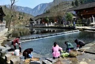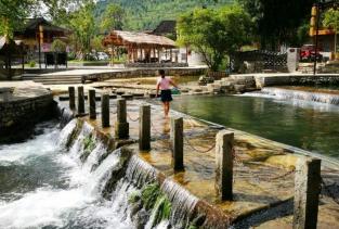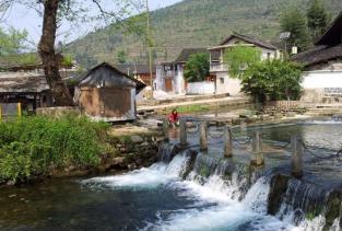 云舍村号称天下第一土家村,距离梵净山10公里。村外建架在太平河上的塔桥很有气魄。进村公路横跨河面,河水没过路面2-3厘米,驾车像在水中穿行。山村青山环抱,村里山脚下蔚蓝的神龙泉清澈见底,涌出的泉水源源不断地穿流山村,流向大河。村民悠然地在潭水流出的溪边搓衣洗菜,一片和祥宁静、世外桃源景象。我们也加入洗菜行列,感受山清水秀的自得悠闲,借用老乡家的灶具做上一顿饭。