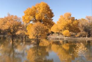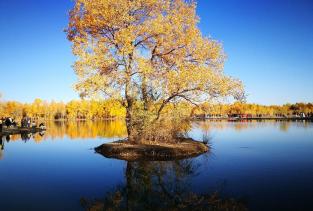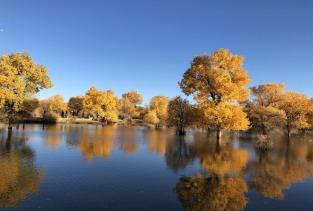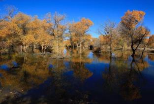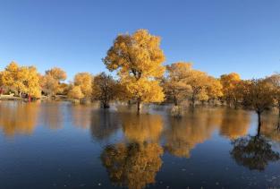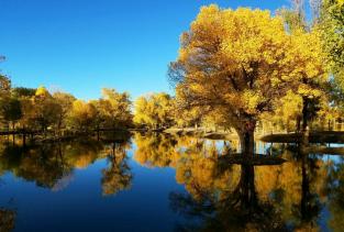 金塔胡杨林,甘肃酒泉的人造胡杨林景区。其特色在于水上倒影,胡杨黄得浓烈,天空蓝的纯粹,水中倒影两种极致色彩辉映,一转眼都是炫目的油画。