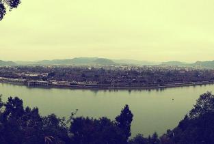 阆中古城保存得比较完整,真是很值得庆幸。 登上与古城一江之隔的锦屏山山顶,可以眺望古城全貌。 一衣带水,四面环山,城廓平坦,透着古人选址的智慧。