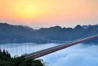 北盘江大桥坐落于云南宣威与贵州水城交界处,横跨云贵两省,全长1341.4米,桥面到谷底垂直高度565米,相当于200层楼高,成为目前世界第一高桥。同时,大桥东、西两岸的主桥墩高度分别为269米和247米,720米的主跨也仅次于后期开工建设的贵黔高速公路鸭池河特大桥,在同类型桥梁主跨的跨径中排位世界第二。大桥由云贵两省合作共建,从桥的中部分云南界贵州界。