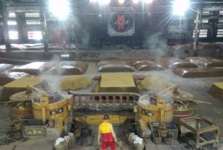 整个泸州国宝窖池景区并不大,刚到景点门口,便闻到一股浓重的酱香味,就是那种大酱的味道,讲解员说那是因为酒曲发酵的原因,进入后,发现是园林式的建筑风格,最远处是整个酿酒过程的石刻画。进入窖池观赏区后,可以看到整个老窖酿酒的过程,有工人师傅们正在生产,幸运的见到老窖原浆从“牛尾”出流出。