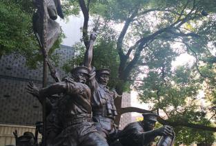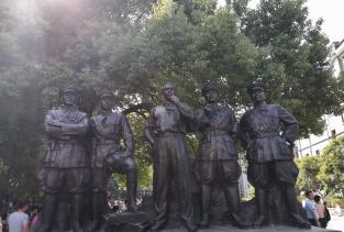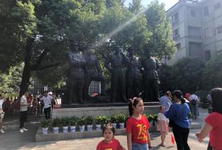 八一起义纪念馆需排队进馆,大概排了十五分钟左右。 纪念馆是免费的,凭身份证领票即可进馆参观。进入馆区,首先引入眼帘的是铜雕,它的右侧的灰色建筑是旧馆,南昌起义总指挥部旧址,铜雕正后方为陈列大楼。