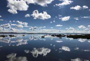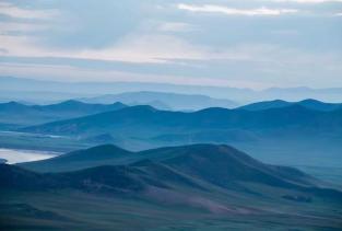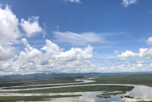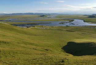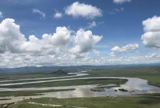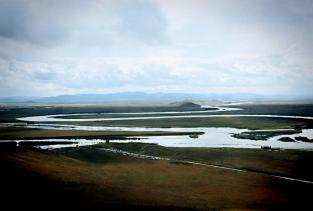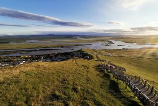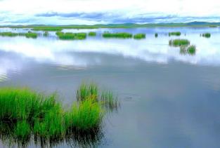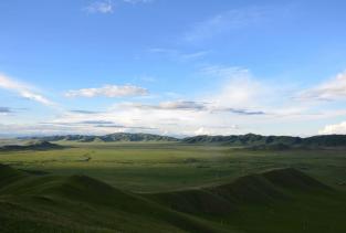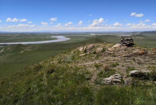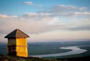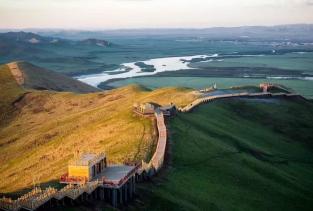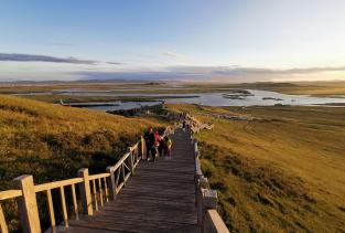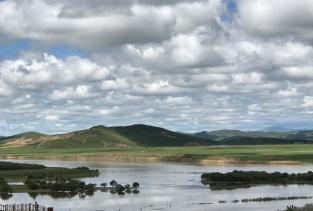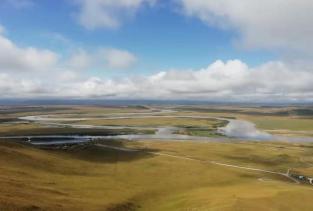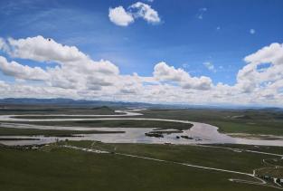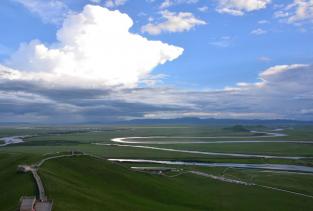 唐克有观光车到九曲第一湾景区,景区有木栈道直达黄河边,也有自动扶梯直上山顶观景台。在观景台上可以清楚地看见黄河S形九曲,像一条玉带镶嵌在碧绿的湿地草原上,蒙古包零星地散落其中,兰天白云,胜似画卷,令人心忋神旷。