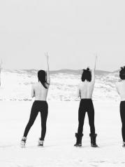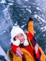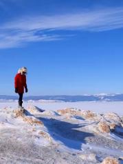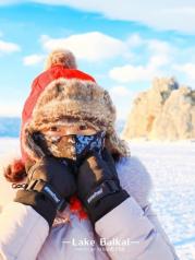 零下30度的贝加尔湖真的是冷入骨髓,任何部位暴露在空气里不能超过半分钟,不然就会感受到刺骨的疼痛,因此我们也是早早地做好攻略,全副武装了自己才出门的。虽是艳阳天的大下午,气温也是低到零下二三十度,全副武装御寒的我们也是傻傻分不清楚谁是谁,然而寒冷也阻挡不了我们内心的欢乐,各种凹造型。远处游客两三,在雪地艰难步行,却是依然挡不住见到此等雪景的欣喜,狂奔而走(虽然也跑不起来~)。