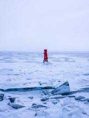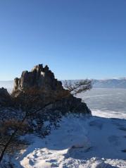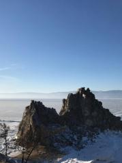 冬天的时候,贝加尔湖面上是厚厚的冰面,可以开车前往。如果是未结冰的时候,是需要乘船前往的。冰面上行驶的感觉还是第一次。司机大哥开的飞快,我一度紧张冰面是否结实,要知道我可是一点水性都不通呀。事实上冬天的贝加尔湖湖面冰层可达一米余的厚度,普通车辆在上面穿行毫无风险。我们看到河面蓝色的部分就是大家用车子开出来的车道了,开的人多了自然就形成了一条路。