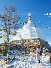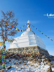 在贝加尔湖畔,有这样一座白塔,供当地人祭祀祈福。白塔在湖畔的小山丘之顶,通体白色,周围系满了经幡,就连边上的小树身上也都绑满了经幡。经幡承载着人们对美好生活和美好愿望的憧憬,同时也给贝加尔湖畔这座通体透白的白塔增添了一份美丽,让旅行至此的我们也不想要如当地人一般祈福一番。经幡迎风摇曳,白塔折射着冬日阳光,却不耀眼,依然洁白而美丽。白塔周围和上山的道路上,许多树枝上常常能见到人们手工织的毛线花儿,十分漂亮。也如同经幡一般装饰点缀着这片冬日的彻白,人们对生活的用心,对自己所住之地的热爱,让我越发爱上了这里。从山坡向下眺望,很难想象夏天时一汪湖水,在冬天竟是一片雪白。向往与此地的生活,这一番美妙景色让我爱极了这里,就像身临神迹之地不愿离去,若是有暇,一定要在贝尔加湖畔的冬日过上一阵子!